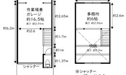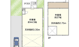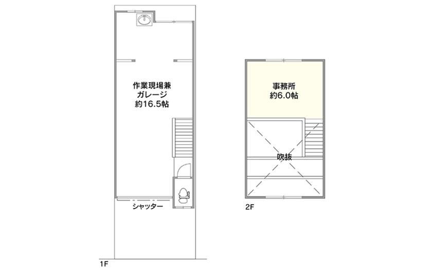 1F:作業場兼ガレージ 2F:事務所、及び作業場 -