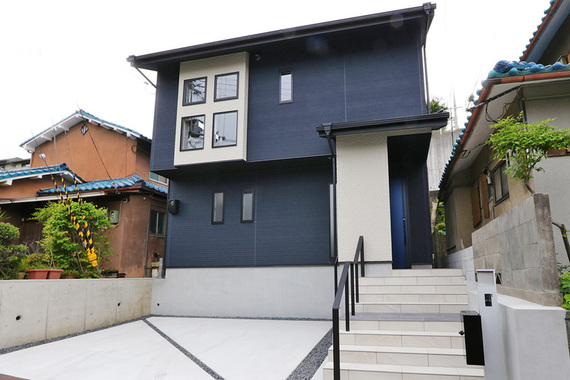 外観はグレーのサイディングと木目を使い、シンプルに。格子なども使って和を感じさせるモダンな建物になりました。